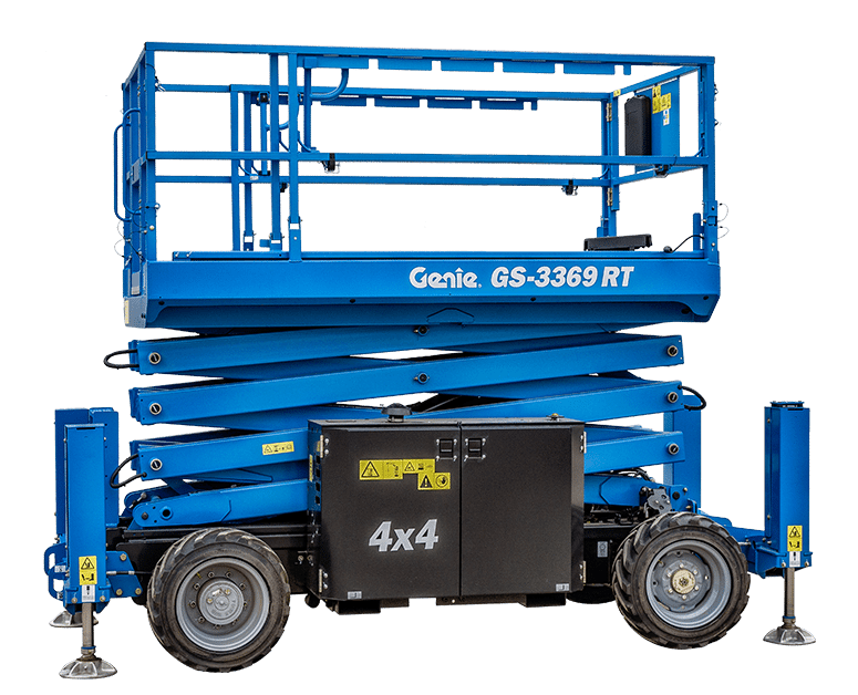 Dieselová nůžková plošina Genie GS 3369 RT je optimálním nástrojem pro vnější výškové práce v terénu a na nezpevněném povrchu. Pro pohyb v terénu je plošina vybavena pneumatikami s hrubým vzorkem a pohonem všech kol s pozitivní kontrolou trakce.
